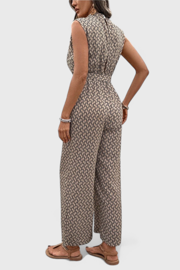 Confiada y sin esfuerzo, Carmela aporta un giro audaz al vestuario de verano. Con un llamativo estampado geométrico, este mono sin mangas está confeccionado en una mezcla de algodón transpirable que se mueve contigo. La cintura con lazo favorecedora y la silueta de pierna ancha crean un look relajado pero refinado, perfecto para paseos al sol, brunchs elegantes o reuniones casuales por la tarde.